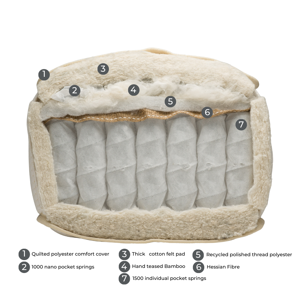 With a pillow-top feel, created by the Nano® Mini-Spring Comfort Layer and hand-teased Bamboo fillings, the Vegan Luxury mattress feels as if you are sleeping on an indulgent topper which readily adjusts with your movement.